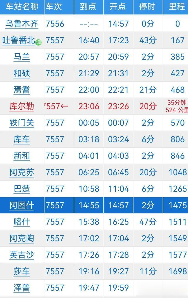 乌鲁木齐到和田7556次公益慢火车全程1996公里,运行32小时34分钟,沿途主要停靠吐鲁番北,马兰,和硕,焉耆,库尔勒,铁门关,库车,新和,阿克苏,巴楚,阿图什,喀什,阿克陶,英吉沙,莎车,泽普,叶城,皮山,昆玉,墨玉,和田。